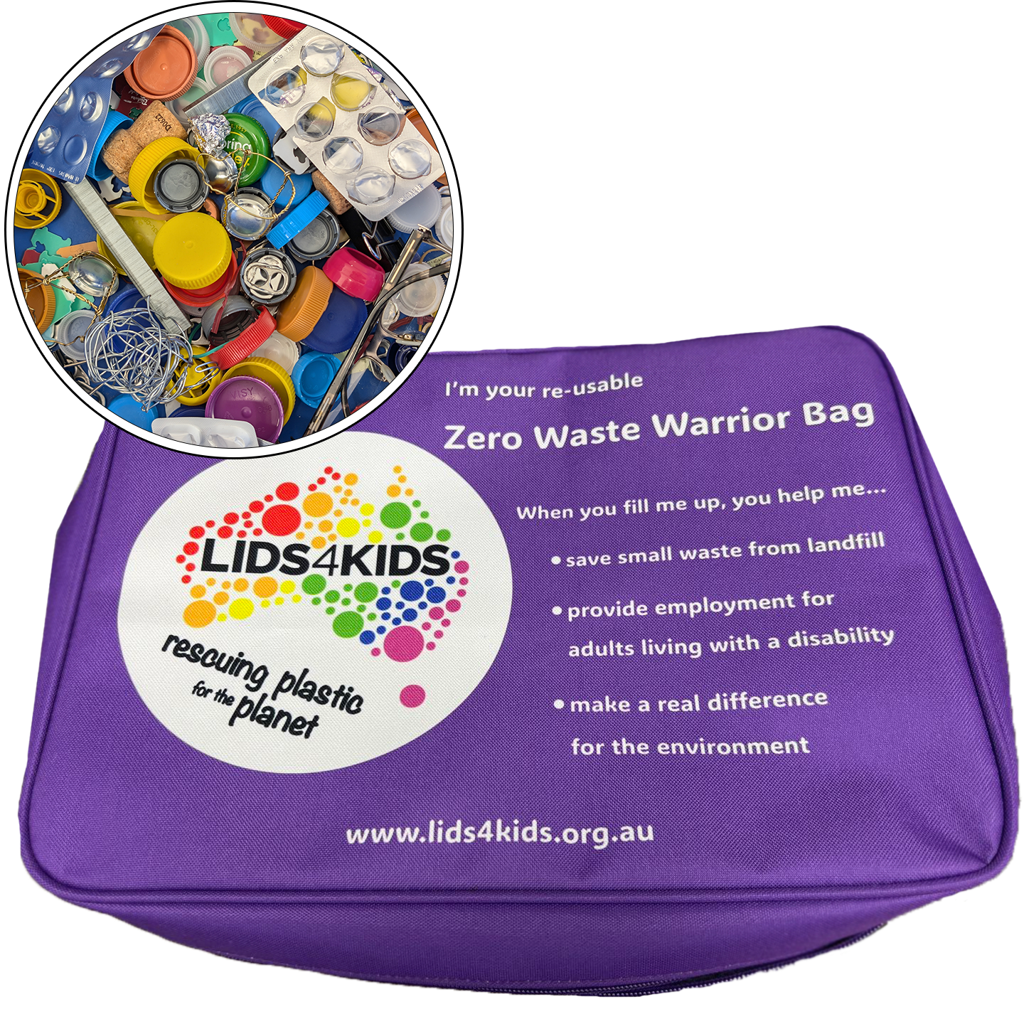 Dirty Lids: Perfect for cafes and hospitality. Toss in your plastic milk, water and soft drink bottle lids every time you open one, zip it and ship it. No work required.
